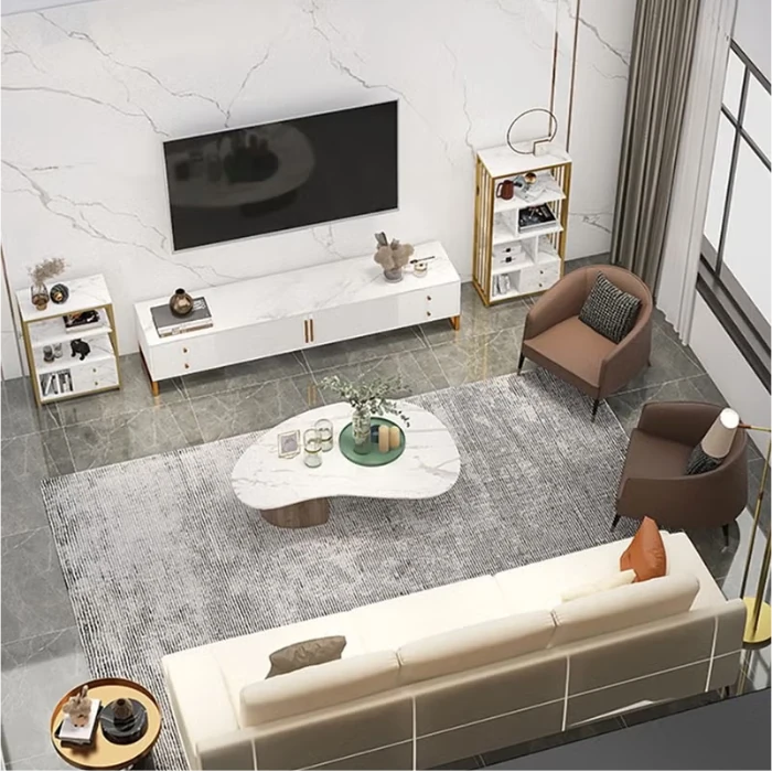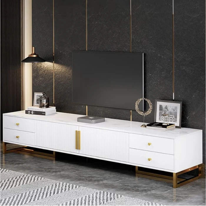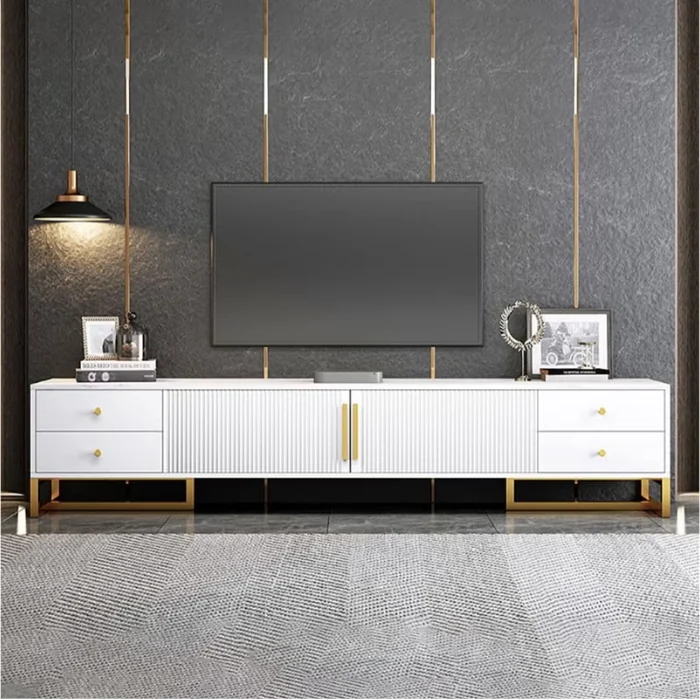Style and process are combined in the Modern TV stand. The TV stand has an innovative design and clean lines that create a fresh and elegant look for your living area. The stand is manufactured from strong MDF, with a white marble top and gold accents that lend it a rich feel, while still being modestly styled. The modern stand has two doors, multiple drawers and concealed shelving for ample storage for your TV accessories, remotes, gaming consoles, decor and other items. This keeps everything organized and tidy.