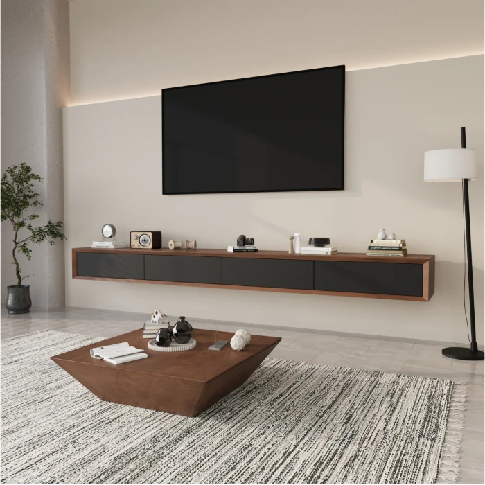 The low profile of the Solano TV Unit provides both a modern and understated aesthetic. The low-profile design paired with the matching MDF creates a sleek and polished appearance for any room. Not only does the Solano unit provide ample storage, but concealed storage is also available through the drawer and shelf space to keep consoles, electronics, and decor organized. The Solano unit can be purchased in three complete finishes (full-black, full walnut and full-white) and will fit perfectly into any contemporary space.